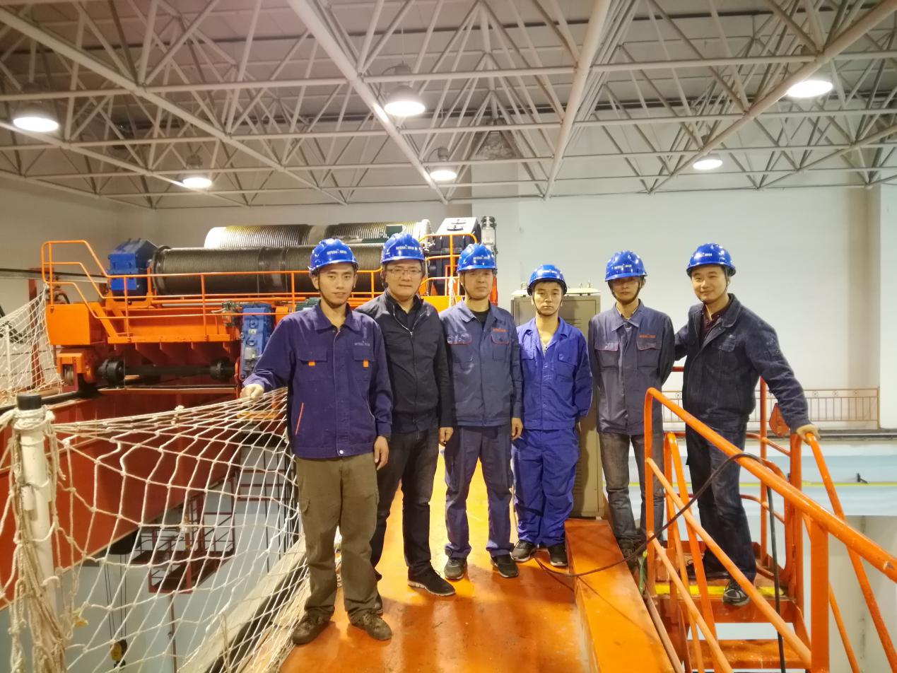 项目组成员在小峡水电站厂房1号桥机上合影