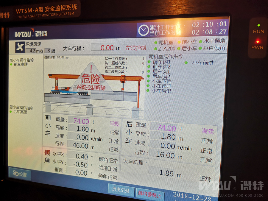 架桥机操作室中配装有微特安全监控系统显示屏、超载限制器及视频监控显示器