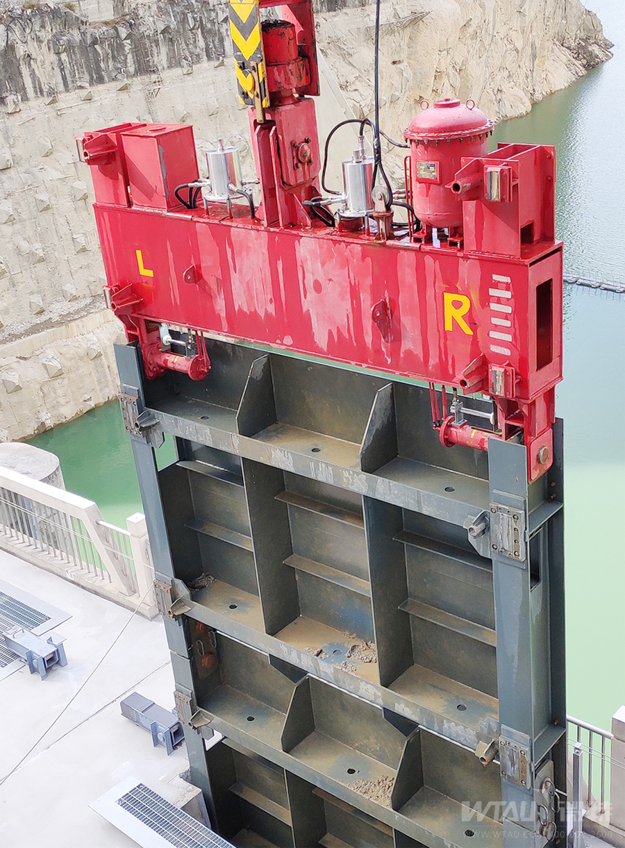 这次改造的进水口两台3200kN/650kN门机,主钩用于提落机组检修门,回转吊用于提落拦污栅、叠梁门。由于每年需要进行一次拦污栅清理,两次叠梁门提落,回转吊使用频率高。回转吊水下抓梁工作深度较深,使用过程中无法直接获取水下抓梁就位及穿脱销情况,水下存在异物时操作风险较大。