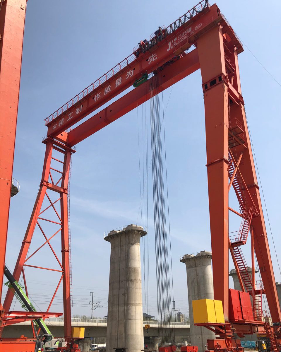 提梁机是一种为桥梁建设而专门设计的一种门式起重机,提梁机既可两台配合抬吊预制梁,也可以单台起重机配双吊具起吊预制梁,主要用于将预制梁从制梁台提吊至存梁台位,预制梁养护完成后将其从存梁台位吊运到运梁车上。