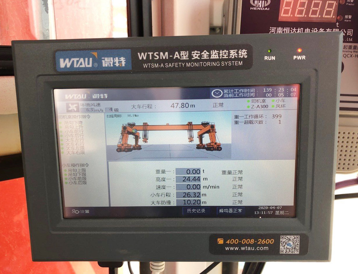 微特为该提梁机配装的安全监控系统对该设备的安全可靠运行起着重要作用。微特研发的提梁机安全监控系统对设备的运行数据进行实时监控,该仪表可以显示提梁机的起升高度,起重量,速度,大车行程,小车行程,同轨道防碰撞,风速,工作次数,超载次数等相关数据实时显示,并对相关数据进行分析判断,防止设备向不安全区域运行。当往不安全区域运行时,该系统首先会预警,并发出声光报警提醒操作人员,并根据实际情况启动控制功能,使设备相关运行机构停止运行,以起到保护作用。