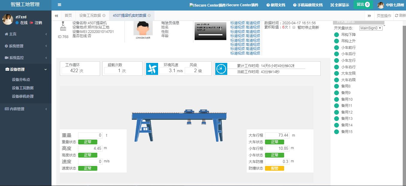 该系统还支持远程管理,用户可以通过手机端,PC端远程查看设备数据,设备位置,违章记录,历史记录,实时视频数据,人员管理等强大的远程管理能力,实现对故障进行自我诊断,对设备可能出现的危险进行有效预警,对发生故障的设备依据历史数据分析功能进行远程诊断和故障修复,全面的提高大型设备运行的安全性。