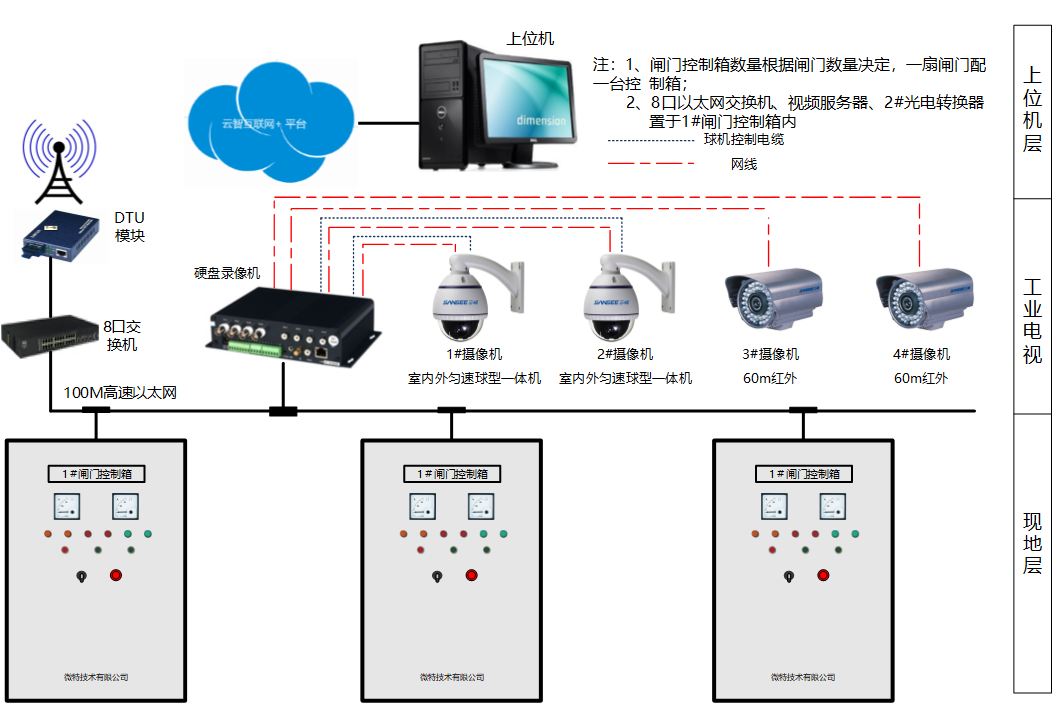 由微特为客户提供的技术解决方案,全系统采用4套闸门现地操作箱和一套可编程控制单元及相关配套通信设施。采用可编程控制器控制方式设计。现地控制单元完成对闸门的数据采集及数据预处理,负责通过网络传送数据信息,并自动服从上位机的命令和管理。