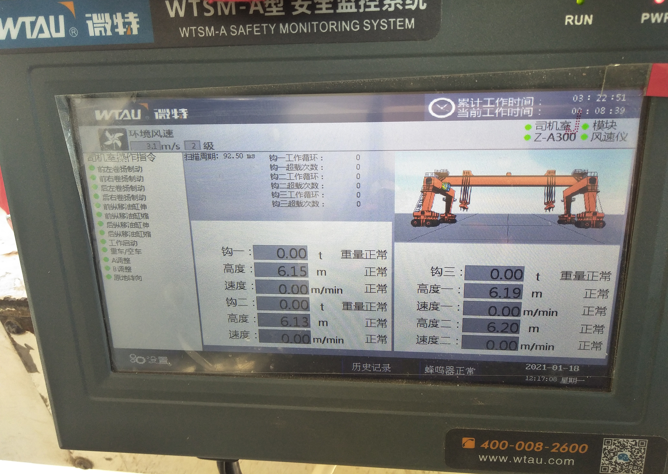 微特研发的提梁机安全监控系统对设备的运行数据进行实时监控,该仪表可以显示提梁机的起升高度、起重量、速度、大车行程、小车行程、同轨道防碰撞、风速、工作次数、超载次数等相关数据实时显示,并对相关数据进行分析判断,防止设备向不安全区域运行。当往不安全区域运行时,该系统首先会预警,并发出声光报警提醒操作人员,并根据实际情况启动控制功能,使设备相关运行机构停止运行,以起到保护作用。