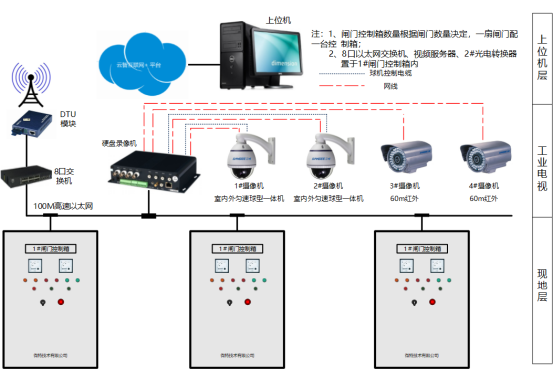 工业视频子系统包括摄像机、传输、控制、显示、存储5大部分。摄像机通过线缆将视频图像传输到控制主机,控制主机再将视频信号分配到监视器,通过控制主机,操作人员可发出指令,对摄像机的上、下、左、右的动作进行控制及对镜头进行调焦变倍的操作,并可通过控制主机实现在多路摄像机的切换。利用特殊的录像处理模式,可对图像进行录入、回放、处理等操作,使录像效果达到最佳。实现紧急远程提门和落门等操作。