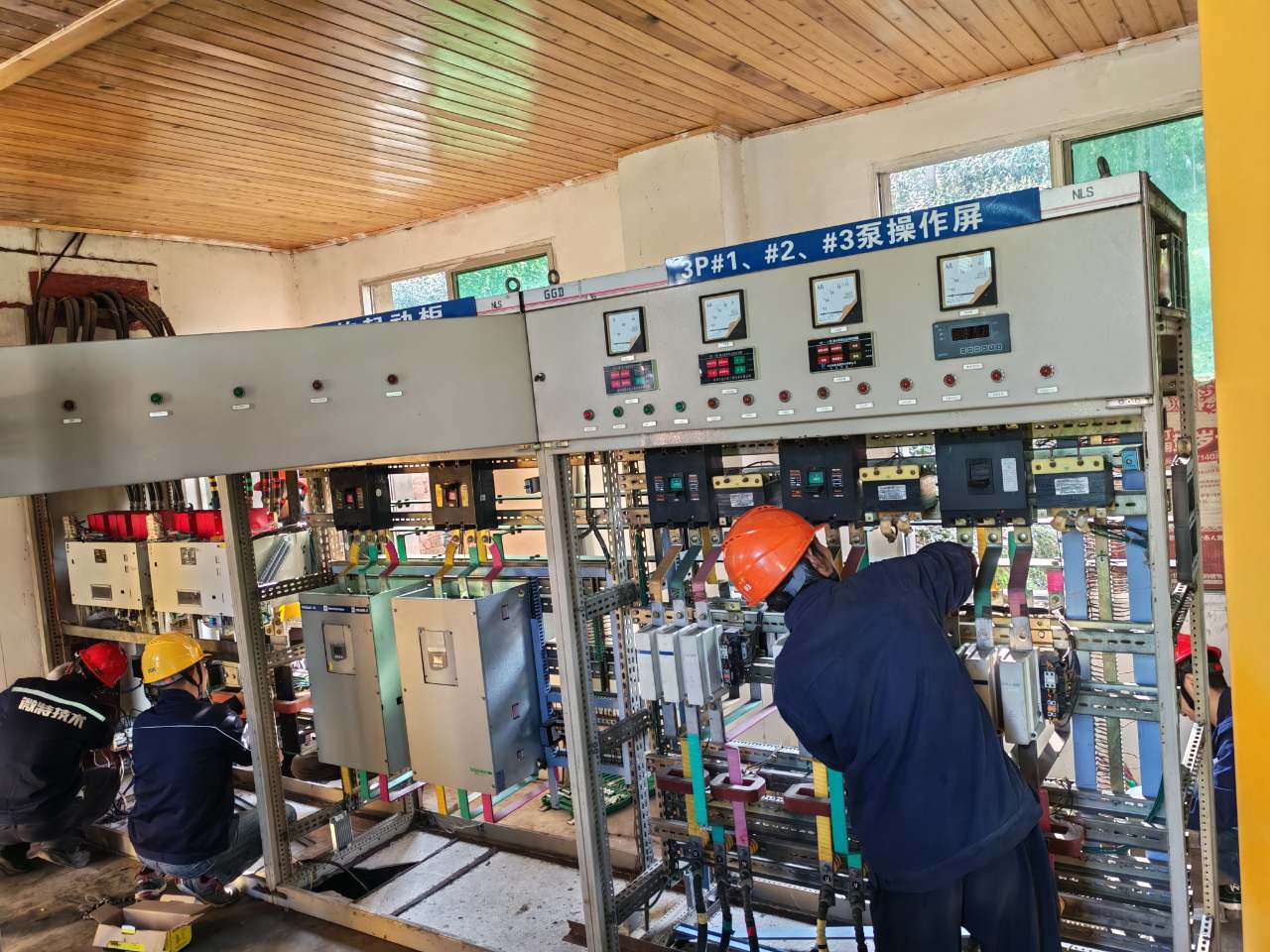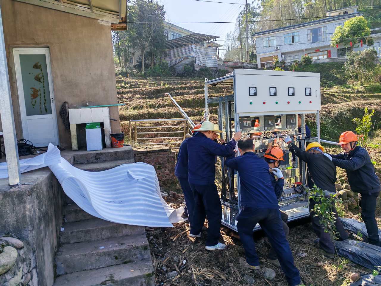 施工时,现场上方电缆与低矮屋檐阻碍吊车作业,超 700斤的盘柜只能人工搬运。且仅有 48 小时断电窗口,否则将威胁周边农田。微特工程师们迎难而上,提前规划搬运路线、选用可靠工具,分组协作搬运盘柜。他们开启昼夜奋战模式,争分夺秒,成功在规定时间内完成三台水泵盘柜更换,及时恢复泵站运行,守护了农田安全。