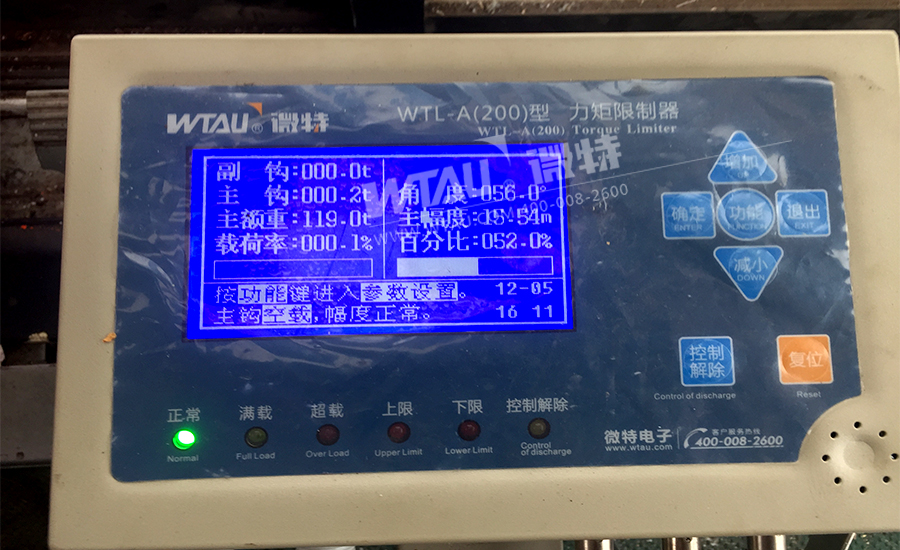 主机WTL-A200型力矩限制器仪表安装在驾驶室里,该仪表可实时显示当前重量,幅度,角度,额重及工况等参数。