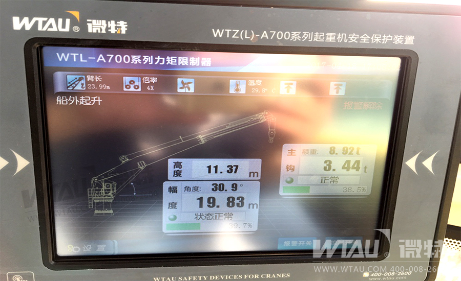 上图为微特电子配备的WTL-A700型力矩限制器显示仪,该型号仪表采用8寸TFT LCD触摸屏,SG高耐蚀性热镀层钢板机身,铝合金面板;IP65防水性,最大800X600(V)像素;可动态仿真的显示当前重量、幅度、角度、额重、工况等参数。并可外接PLC,智能仪表,板卡,模块,变频器等工业自动化设备。显示仪自带8M内存,并可扩展外部记录SD卡。