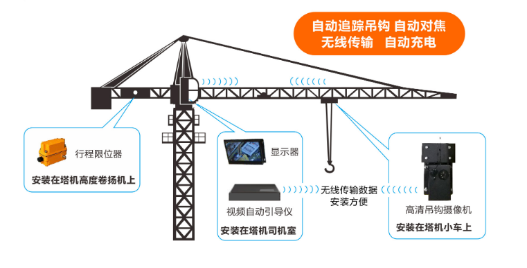 将摄像机安装在塔式起重机大臂的最前端或者吊钩上方,拍摄区域不会被其它物体遮挡,镜头可自动追踪吊钩,自动对焦,司机可清晰的看到拍摄画面,根据拍摄画面自主判断吊装情况,结合信号员的引导达到双保险的效果。