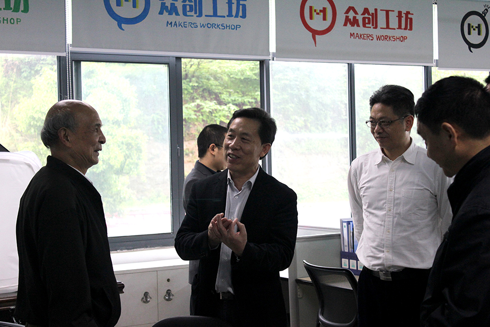 上图:在众创工坊董事长聂道静向郭主席一行介绍工坊为创客们提供一个免费的智造平台