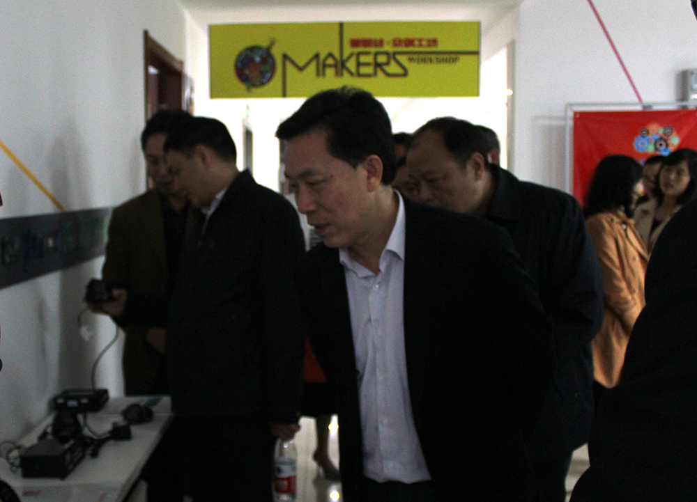 上图:在众创工坊郭主席一行参观创客制造的产品展示