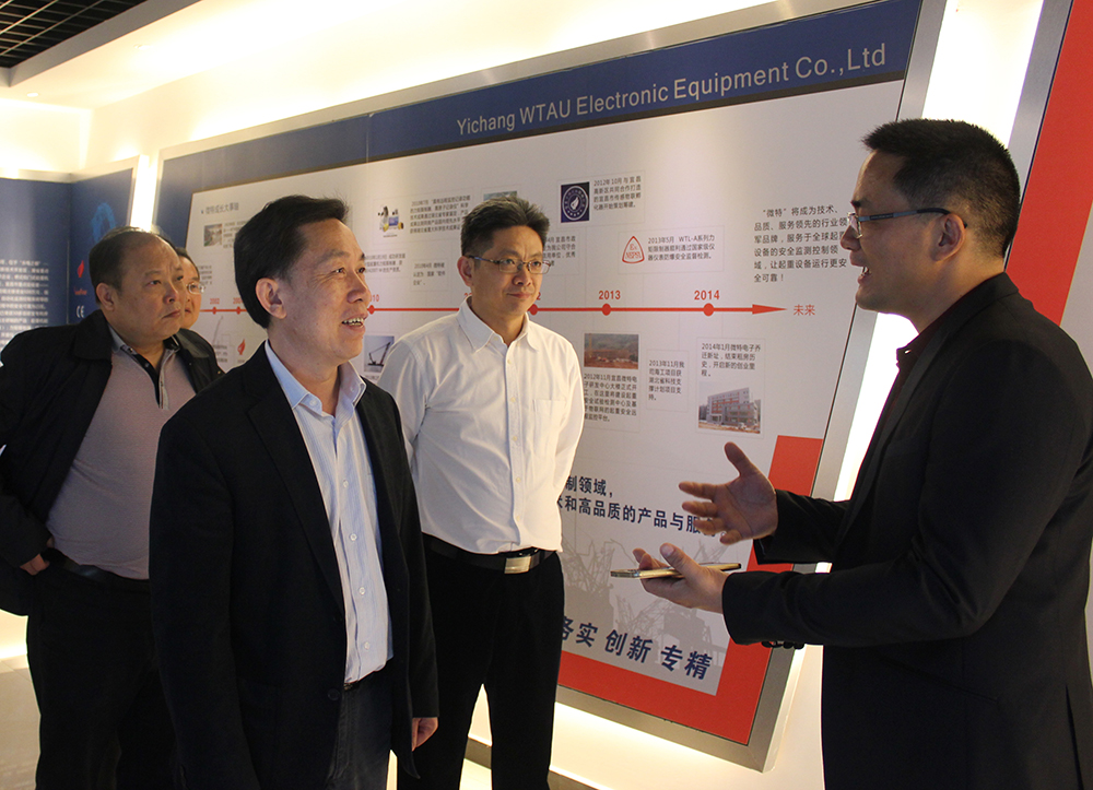 上图:郭主席一行来到宜昌市微特电子设备有限责任公司,聂道静作为微特创始人在展厅向来访领导介绍微特电子的发展历程。
