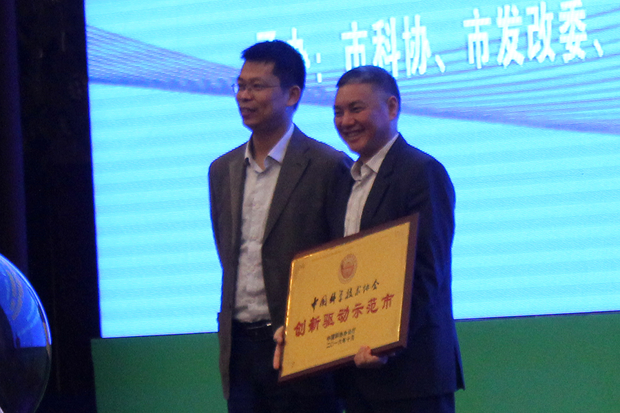 中国科协“创新驱动示范市”授牌仪式上,中国科协学会服务中心副主任徐强(左)授牌,副市长王应华(右)接牌。