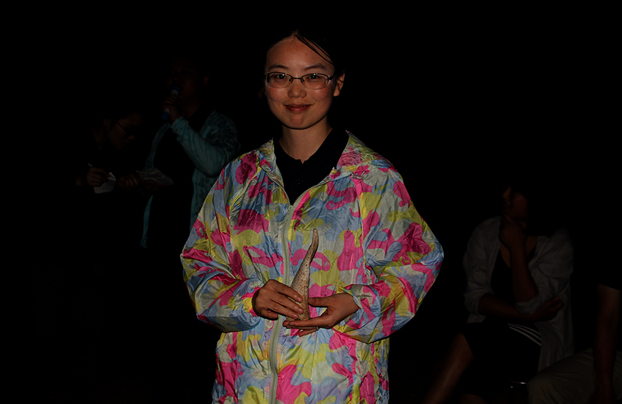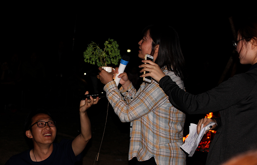 晚会最后,各队拿出各自行军过程中寻得的宝物,在这里微特公司首次爱心拍卖会温情上演。(上图为Supreme队持宝人正在讲解她所持的盆栽宝贝,左右两边的队员正在为宝贝打灯光)