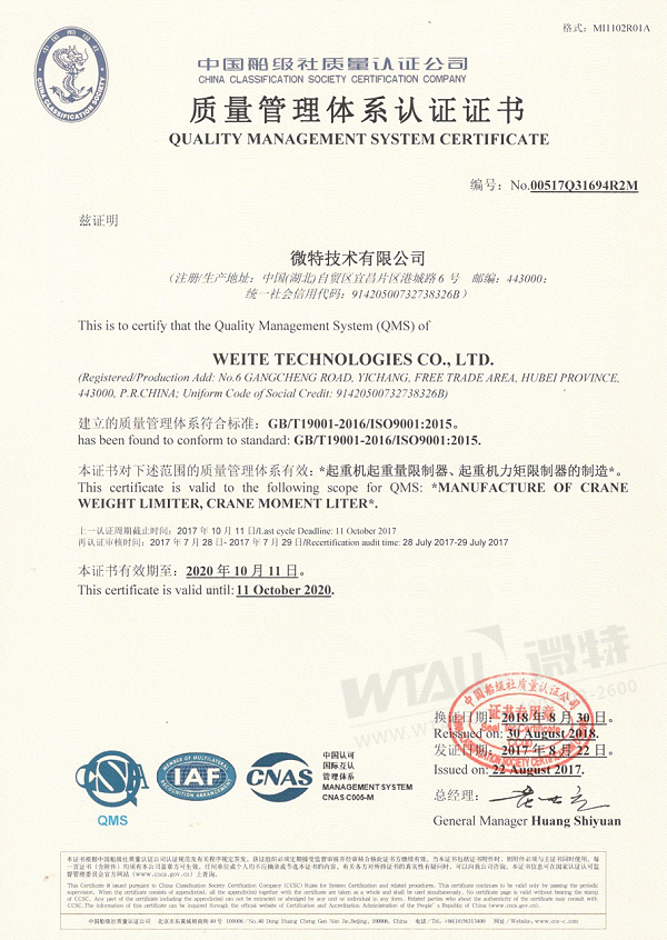2018年9月12日,微特技术有限公司品控部收到由中国船级社认证公司寄来的微特技术有限公司ISO9001:2015质量管理体系证书,标志着公司顺利通过2018年度的质量体系船级社审核。