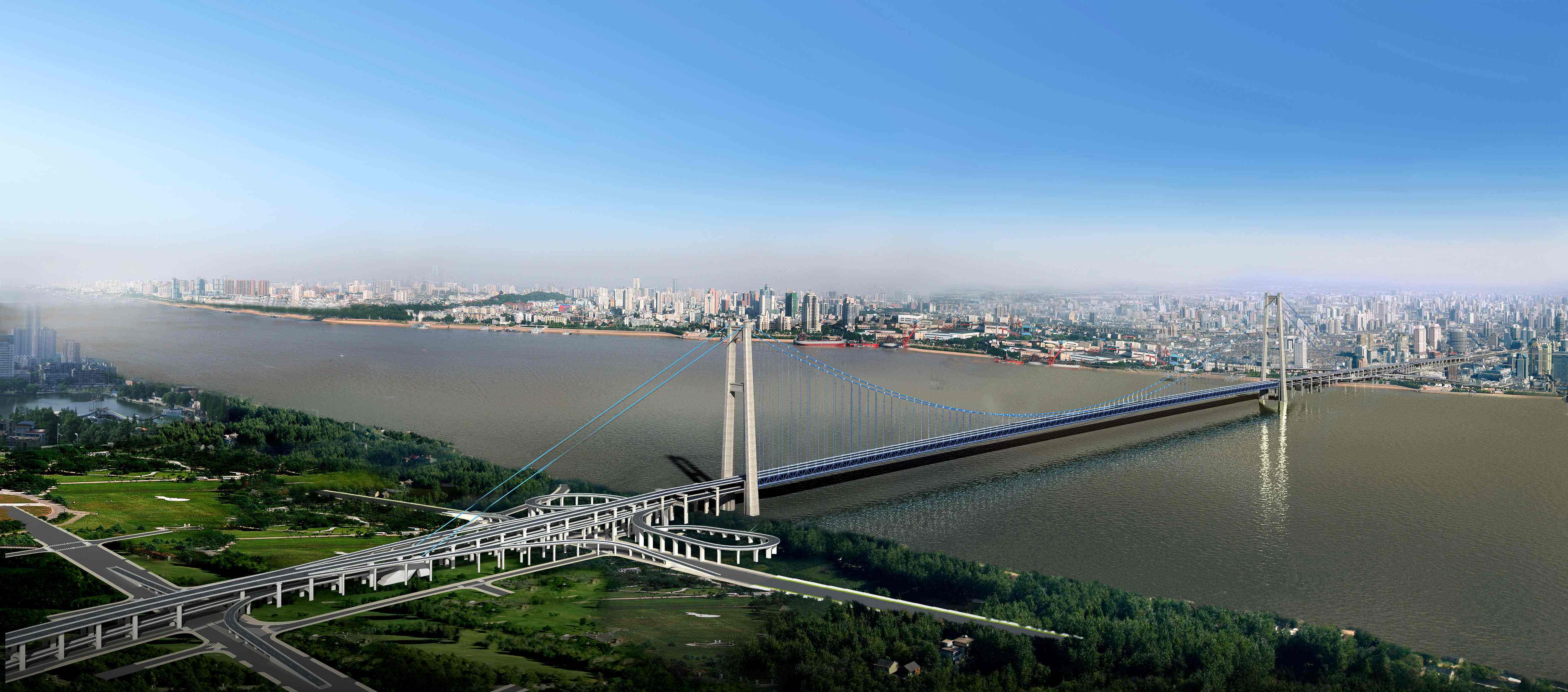 杨泗港长江大桥位于武汉白沙洲大桥和鹦鹉洲大桥之间,起点设在汉阳国博立交,从汉阳汉新大道跨鹦鹉大道、滨江大道过江,武昌岸跨过八铺街堤、武金堤后,止于八坦立交,连接武汉三镇中的汉阳区和武昌区。杨泗港长江大桥总长约4.32公里,是武汉第一座双层公路桥,即上下两层都走汽车,共12条汽车道,两侧设置观光步行道。杨泗港大桥采取一跨跨越长江的方案,跨度长达1700米,是世界上工程规模最大的双层悬索桥,其悬索桥跨度在国内排名第一、世界排名第二。(来源: