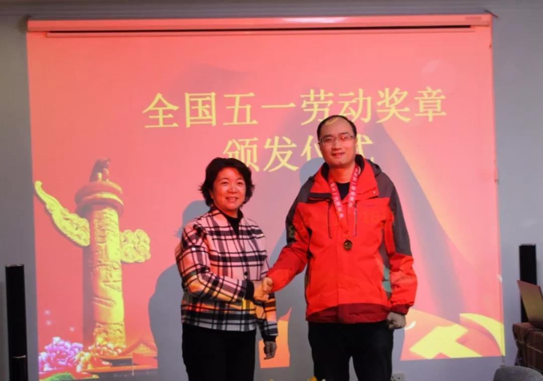 宜昌市总工会党组成员、女职工委员会主任朱利民为劳模高钰敏颁发全国五一劳动奖章