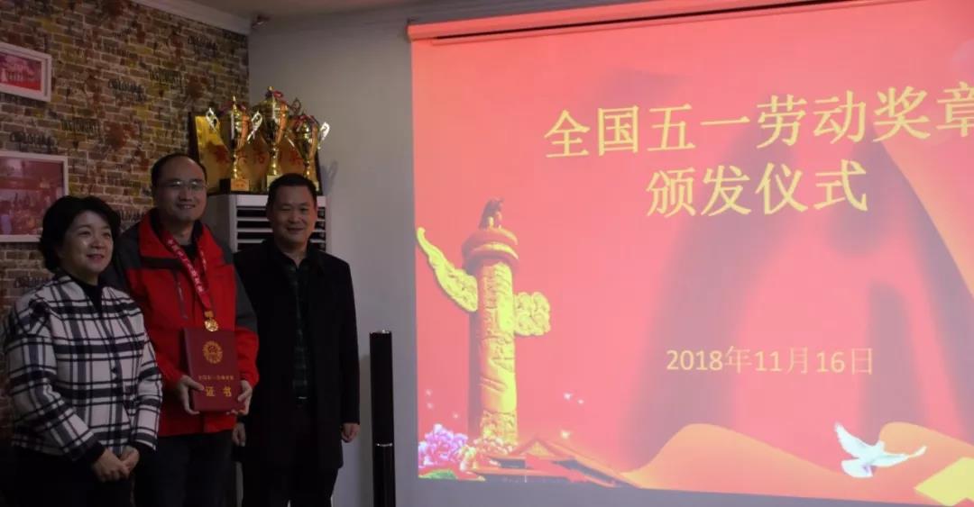 11月16日,宜昌市总工会党组成员、女职工委员会主任朱利民,高新区总工会常务副主席冯和如一行莅临微特智慧谷,为微特技术副总经理高钰敏颁发全国五一劳动奖章及荣誉证书。