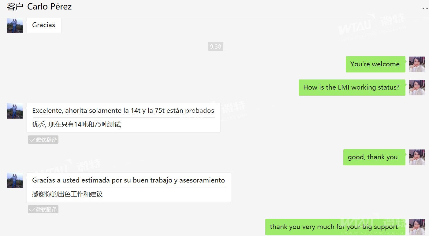 微特外贸经理Riki收到来自中美洲尼加拉瓜客户CARLO对微特力矩限制器产品的反馈, 并发来部分客户自己安装调试的产品图片及吊车现场工作图片。此次合作,微特协助客户在14T随车吊上安装了WTL-A200力矩限制器以及在75T汽车吊安装了WTL-A700型力矩限制器。 跟踪产品使用状态时,客户给出了非常满意的答复并对微特外贸经理的合理选型及沟通建议表示感谢!