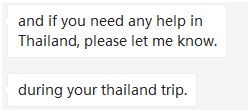 这句话(在你的泰国旅途中,如果需要帮助,请联系我)出自很多泰国用户之口,虽然很简单,但温暖着在路上的微特人。在泰国,语言的差异早已不是出行中的大问题,最大的问题是在曼谷以外的区域,打车难是最大的困扰,UBER/GRAB叫车基本无人应答,甚至大街上都看不到一辆出租车,而客户总是施以援助之手,安排司机接送。