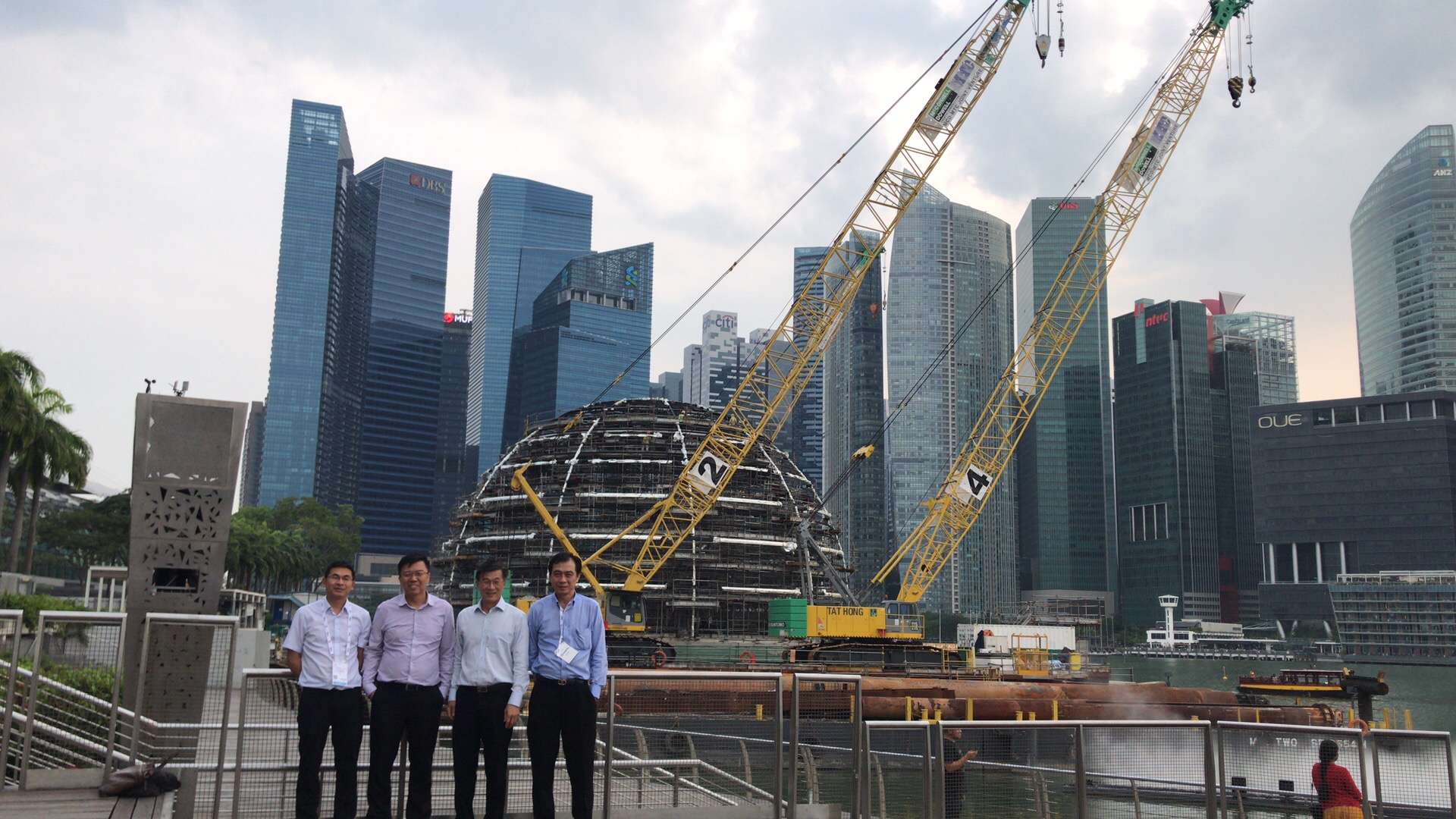 ▲微特事业部总经理与新加坡达丰公司在会场外的工地现场合影,背后正在施工的吊车上安装的正是微特的力矩限制器产品