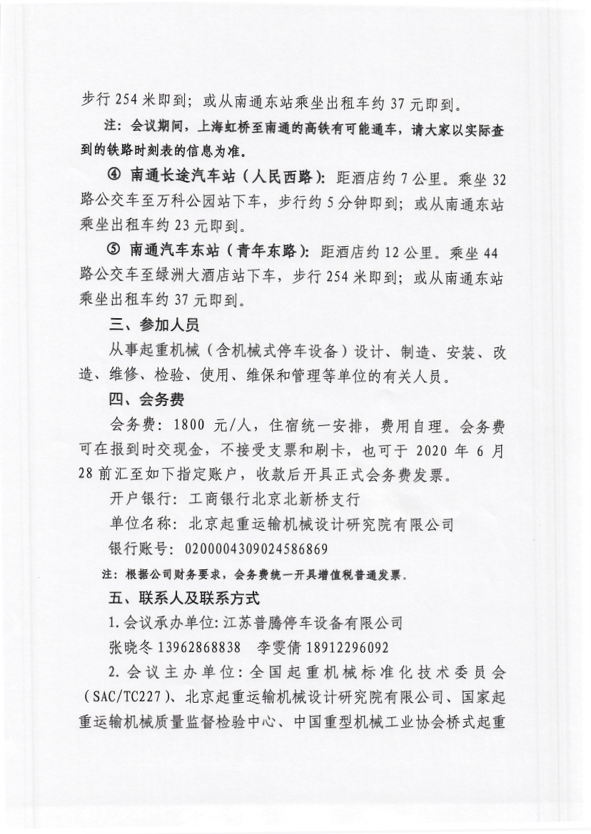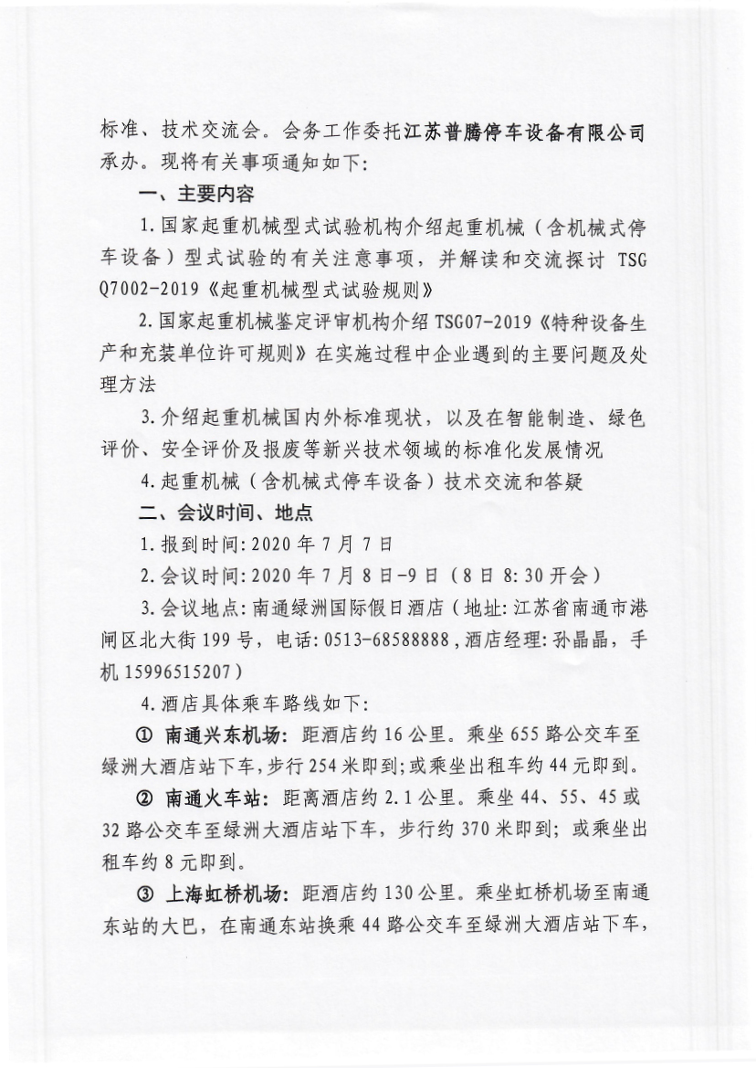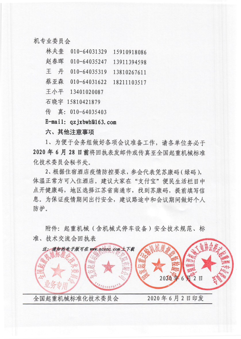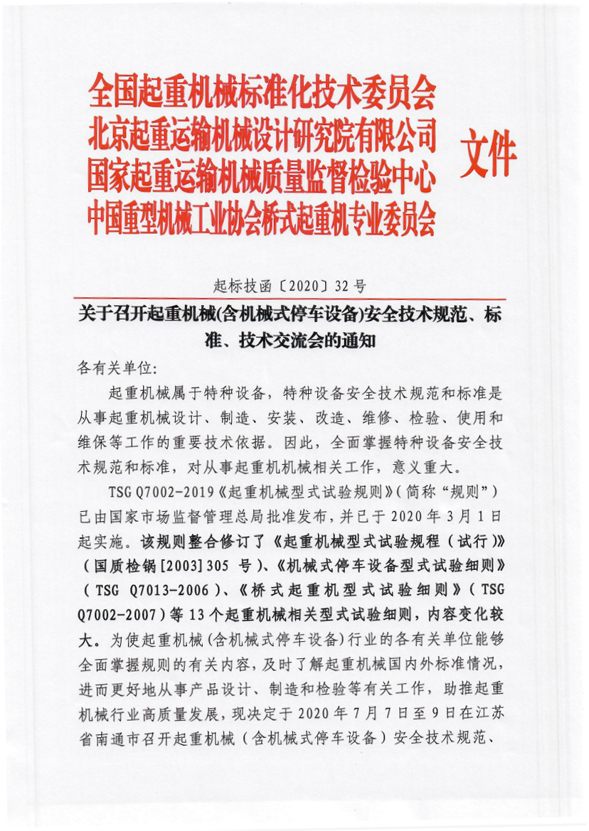 日前,由全国起重机械标准化技术委员会、北京起重运输机械设计研究院有限公司、国家起重运输机械质量监督检验中心以及中国重型机械工业协会桥式起重机专业委员会联合下发文件,定于2020年7月7日至9日召开起重机械(含机械式停车设备)安全技术规范、标准组织、技术交流会。