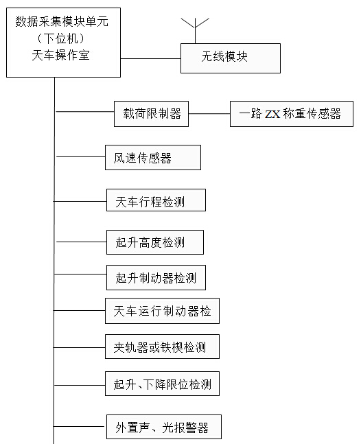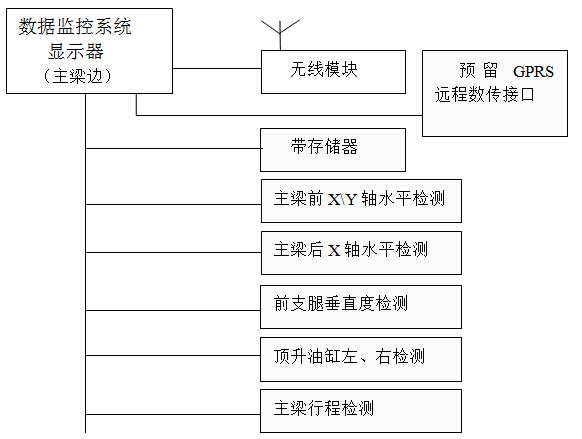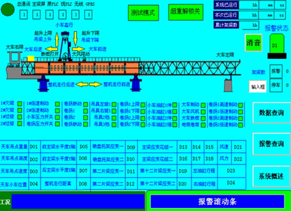由于该拼装架桥机的特殊性,本套系统方案配备有信号采集装置(下位机)1台和一套图形显示终端含存储(上位机),能够实时的显示所监控的各个参数,并对所有的监控对象能作出显示、报警、数据分析、查询、记录及动作输出等功能。数据保存能保存30个连续工作日。设备数据具有导出功能,通过USB口或网口可将数据导出作为长久保存用。设备具备远程通讯接口,可将数据和视频通过GPRS或3G模块将数据发至服务器,实现远程监控。