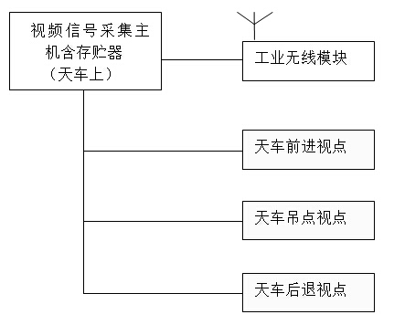 本方案视屏系统的配置结构主要有:3路摄像头和存储器、、无线模组、显示器等主体结构构成。主要监视天车前行区域、天车后退区域、天车吊点区域的工作面为主要监视区域,信号通过无线模块传输至安装在大梁上的视屏显示器显示
