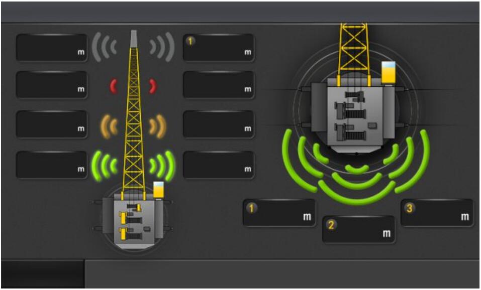 区域主动防碰撞系统: 通过雷达主动监测起重机易碰运动部位路径,探测区域空间内是否有障碍物,以此来避免吊机与吊机间,回转部位与其它物体、臂架与周边物体之间的区域空间是否安全,在安全区被入侵时发出声、光报警,甚至给出止停控制信号,实现主动防碰撞监测保障设备安全。