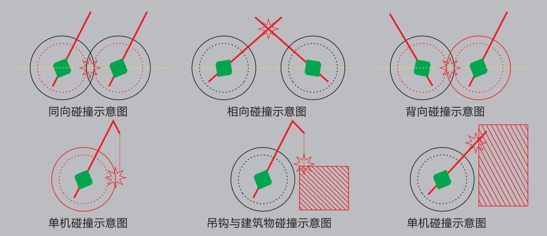 三维空间定位防碰撞系统:三维空间防撞系统是通过在有相互干扰的设备上加装空间防碰撞系统及信标,建立碰撞关系来判断吊机与吊机之间在三维空间中的定位,从而实现吊机运行在安全区域避免相互碰撞发生事故。