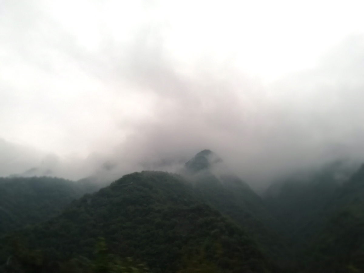 山上的路,和三年前一样,一路上有大卡车在运送着泥土或石子。有两处工地,在做塌方修复施工。雨慢慢也下大了,逐渐的山里雾气弥漫,能见度不足100米,车速越来越慢了。