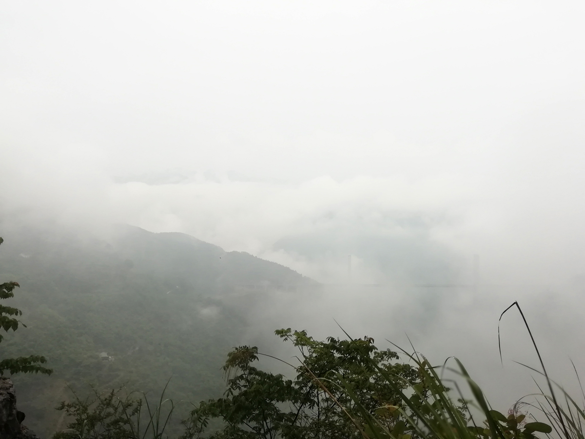 路边便是陡峭的崖壁,可以隐约地看到远处有一座桥梁横跨在两山之间,云雾之中,破为壮观。这里的空气,让人有一种久违的感觉。