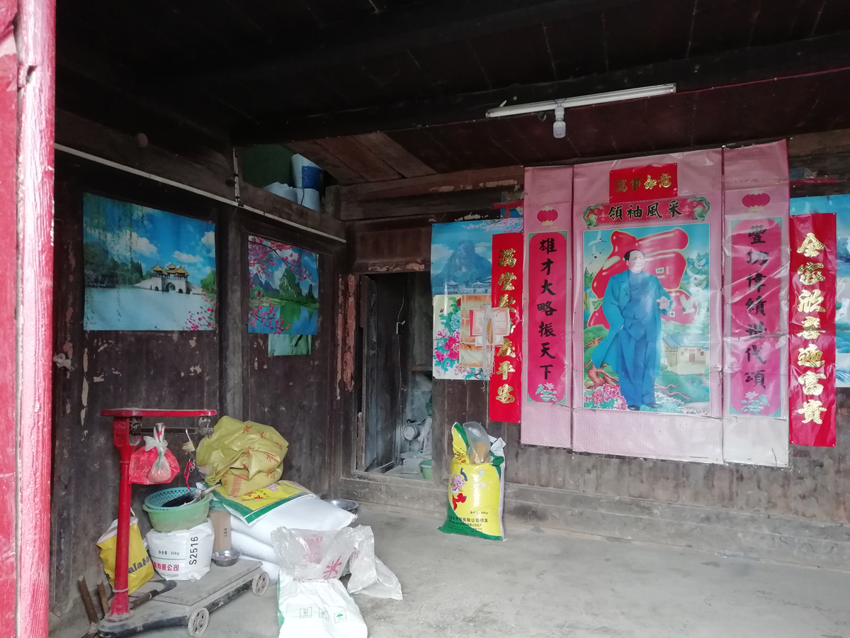 小邱家的院子,左侧是三间猪圈,地上晒着木瓜,往前走便是主屋。主屋里的中堂挂着毛主席的画像,两侧贴满的小邱同学上学期间的奖状。