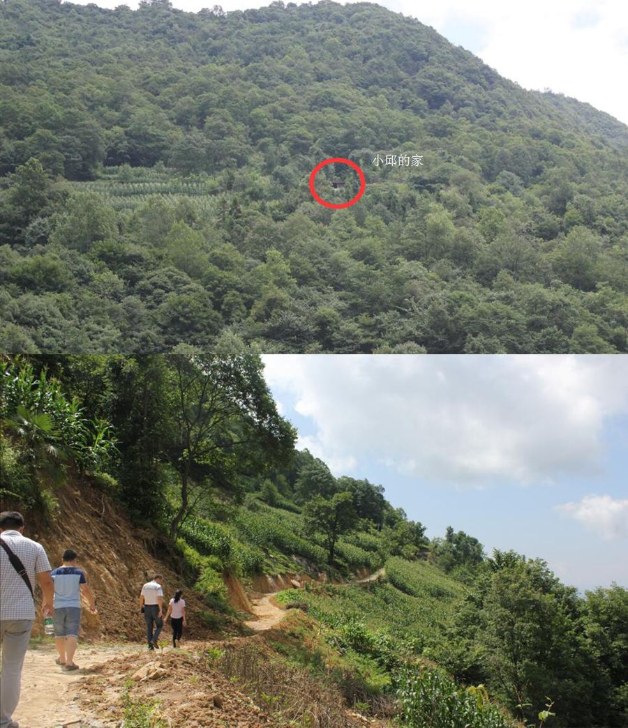 车在小邱小学班主任覃老师家的路旁停下,再往下开,怕是连越野车也抗不住了。大约还有3里路,我们同一起来迎的邱爷爷走着上去。
