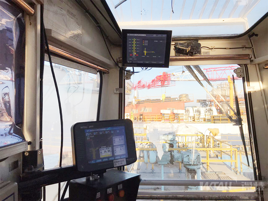 在某一工作区的吊车上,原有一块显示屏,原本是用来显示力矩数据的,加装了新的安全防护装置以后,驾驶室内就出现了两块显示屏,操作人员希望将关键数据显示到老的显示屏当中,进行集中显示,避免在操作时分散注意力。面对客户的合理需求,我们修改了安装方案,将新的显示屏安装到操作视野外,通过修改原有仪表的程序,将关键数据与报警信号发送到原有仪表上,与原有设备成功联机运行,满足了客户需求,顺利的通过了客户验收。
